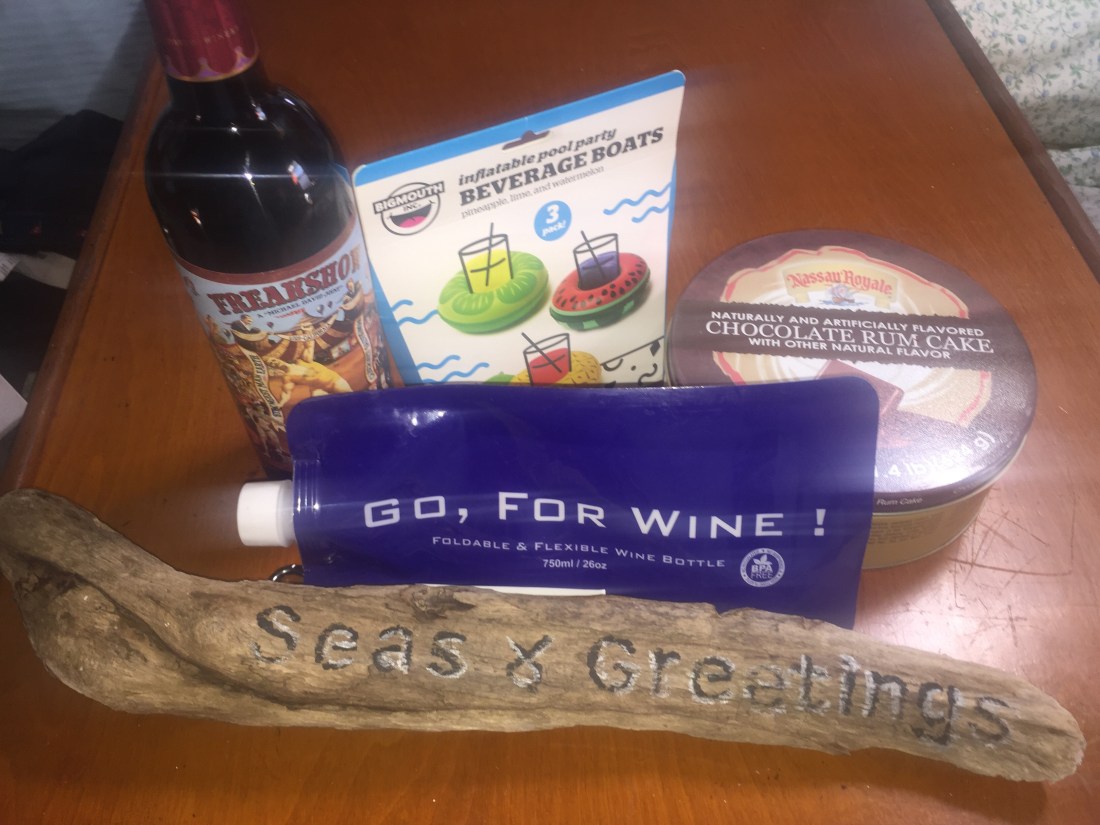 After a yummy grilled chicken or tilapia salad lunch we enjoyed a gift swap with about 35 people in attendance. Tom got the honor of having his gift stolen the most times, six that we recall! Someone had made homemade cinnamon buns and paired it with a can of nuts and a bag of pumpkin spiced M&Ms. There were 2 identical gifts like this and Tom swapped for each of them, but they were stolen 3 times each then frozen; meaning the third person gets to keep the gift. He also opened a hammock, had it stolen, later stole it back, and had it stolen again!! Then he opened a Popeye Captains’ hat, corncob pipe, and a small can of leaf spinach. That was stolen too! We ended up with some very nice gifts: Tom received a bottle of Freakshow red wine, a wine skin, and drink floats. Anita has a dark chocolate rum cake that smells heavenly!! We also won a door prize of a table decoration of a piece of driftwood that says Seas Greetings. We now have one Christmas decoration on board!