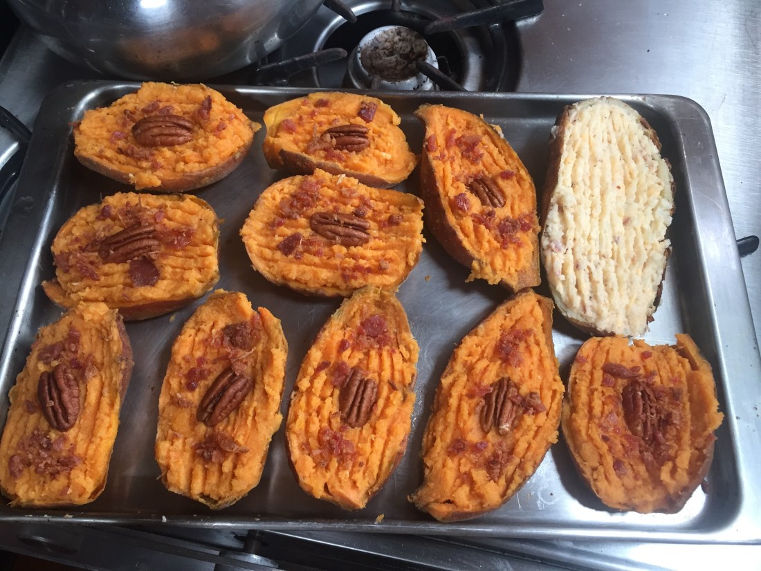 On Christmas Eve we baked white and sweet potatoes and mixed up the innards to make twice baked for the Christmas day potluck. Tom is a master at the white and Anita used a simple recipe for the sweet, just add 2 tablespoons of maple syrup and butter, dash of salt & pepper and then garnish with a pecan half and bacon bits. Both were a big hit and delicious!