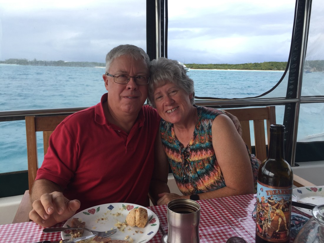 Christmas Day was the beginning of a five day stretch of strong east winds; over 20 Knots and often gusting above 30. The first couple of days were also rather wet with scattered rain showers. The organizer of the potluck decided to cancel the beach part of the potluck due to the probability of rain. Plan B was to have the small groups meet on host boats. Our group met on Boatel I a 65 foot trawler that is a top-rated bed and breakfast in Toronto Canada in the summertime. Note the picture of the trawler was not taken on Christmas Day, although the picture of us was.
