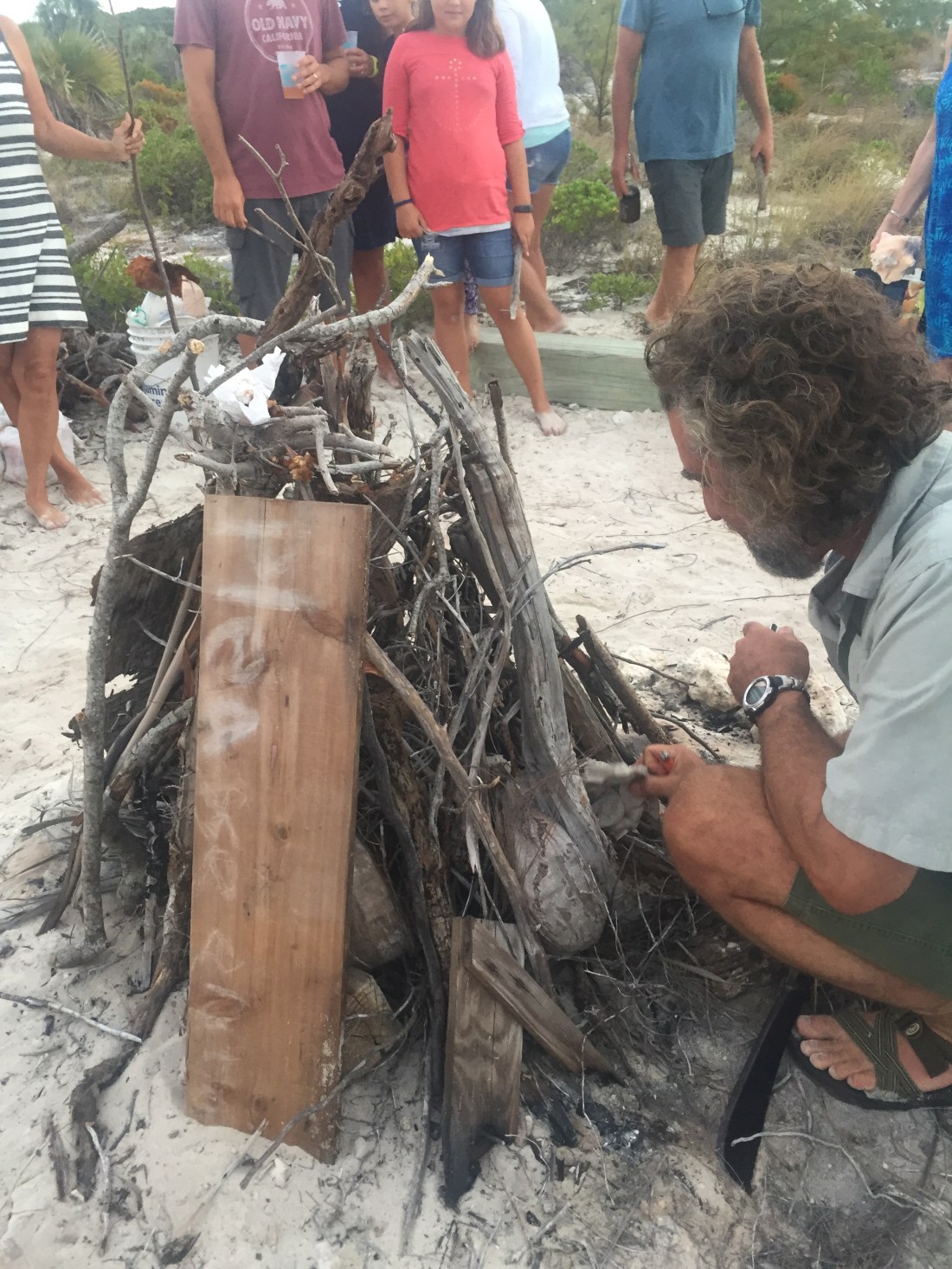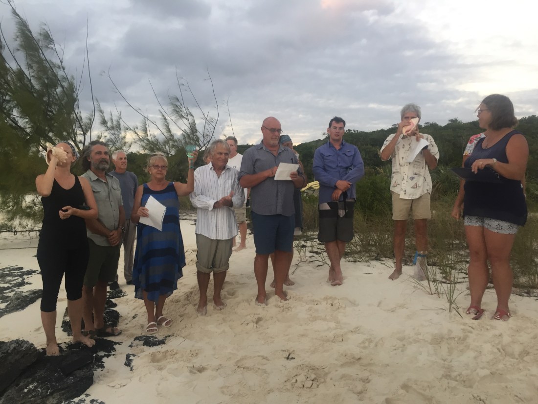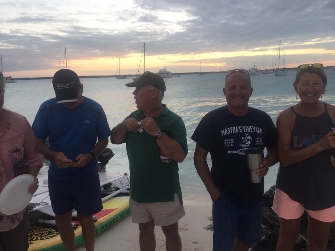 After beach church on Sunday we moved Lone Star a couple miles down island to Sand Dollar beach. We joined about 60 other cruisers for an early New Years sunset celebration, blowing into conch shells and a bonfire on the beach with lots of appetizers.