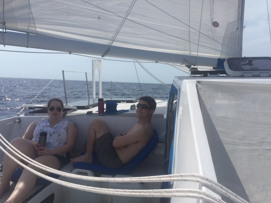 Our son, Alex and girlfriend, Jenna flew in to Nassau on Thursday afternoon, April 4th. They each had only one carry on backpack. Alex’s was very heavy and nearly half filled with spare parts for us. TSA entertained them in the US by trying to guess what the parts were. They didn’t guess any correctly. Bahamas customs only wanted to know the name of a marina or dock our boat was at. We were anchored off Junkanoo beach near the cruise ships so our boat was not near a dock or marina. Rather entertaining to see them insist on the name of a nearby dock. They finally used the name of the cruise ship dock. The taxi ride and picking them up at the beach via dinghy went smoothly. Around 10 PM, the hull started vibrating with deep bass music that was playing on shore. It didn’t stop until 1:30AM. Welcome to Nassau!The next day after breakfast, we sailed down wind out of the harbor heading northwest for the Berry Islands, 35 miles away. The wind was lighter than expected so we motor-sailed occasionally.