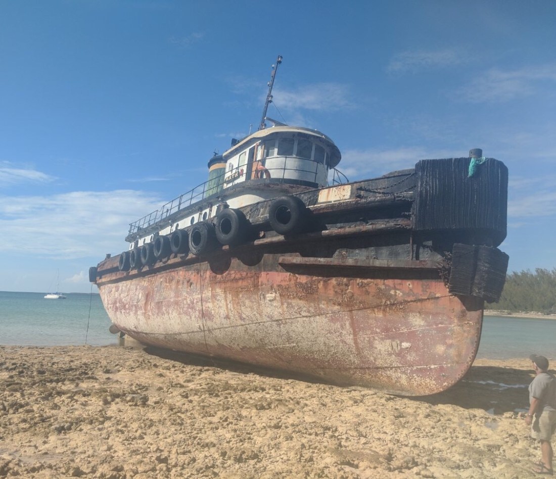 Off came the sail covers, up went the sails, we turned off the engine and sailed 14 miles to the north end of Andros Island. Our entrance into the harbor was quite exciting as a brief rain squall came through with heavy rain and 20+ knots of wind. Alex expertly steered Lone Star through the reefs on both sides. Then hovered in the wind while Tom and Anita lowered and wrapped up the sails. We had plenty of protection from the southerly winds for the next couple days and a new place to explore! We waited until afternoon when the sun was lower to dinghy ashore. We poked around a few wrecks on the beach:Lone Star at anchor, a beached Tug, and Tom for perspective.