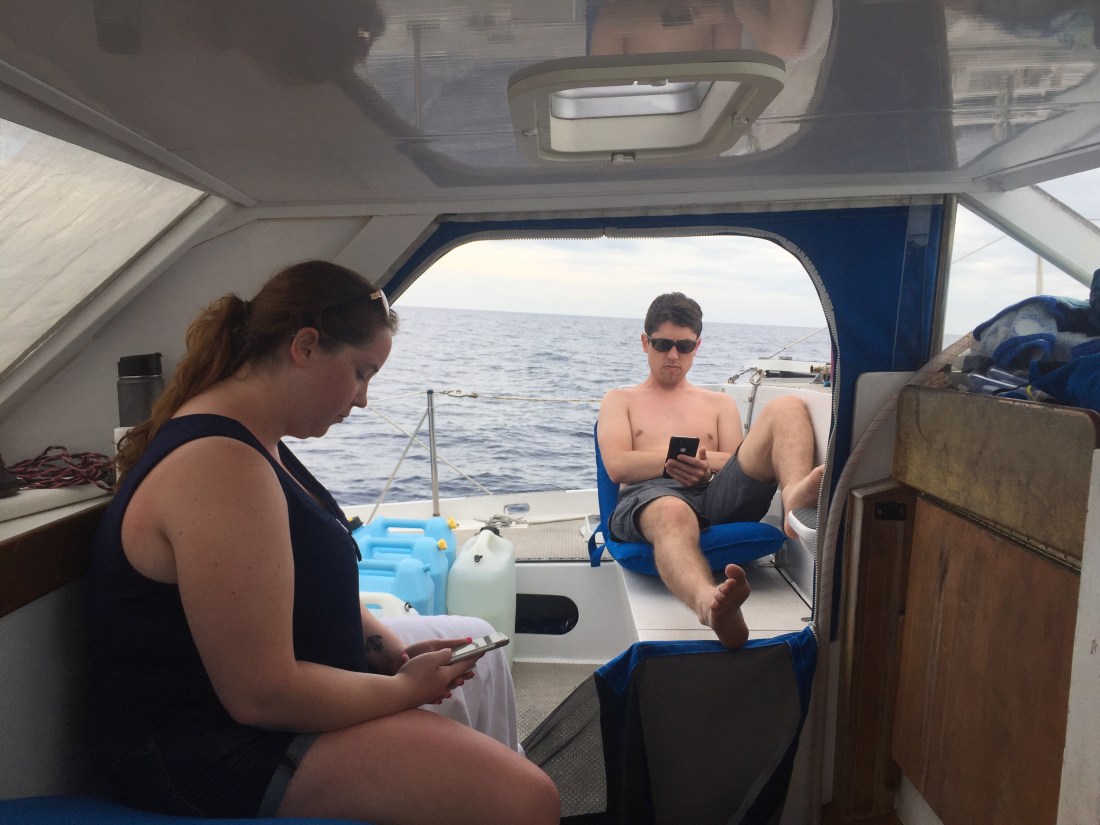 Snorkeling here was pretty good. Both Tom and Alex took video. Tom and the affianced couple took the dinghy to a beach on the south side of the island in the morning. In the afternoon, they snorkeled again near Lone Star on the north side. This was actually better; more fish and variety of coral. Somehow Tom still squeezed in an engine maintenance project: replacing the salt water pump and belt. He also went swimming and scrubbed the bottom. Busy day and everyone is tired, but happy!