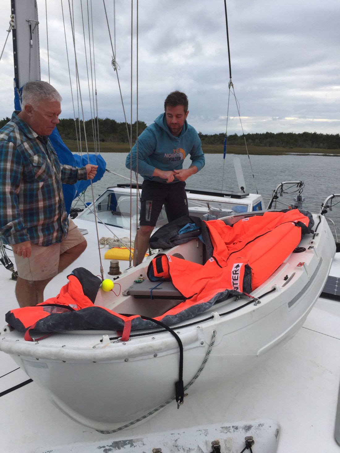 On Saturday afternoon we started our last project before the passage south: making the Portland Pudgy into a lifeboat and storing it on deck.