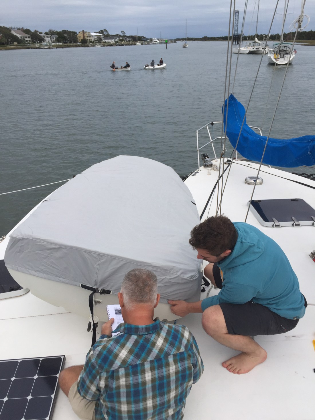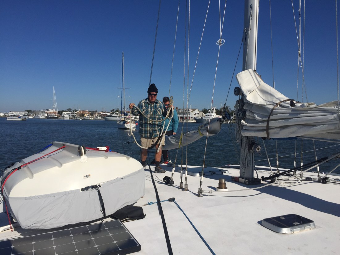 Our weather window was originally Friday, then Saturday. It finally settled into a firm Sunday morning departure. This gave us time to do our remaining chores slowly and enjoy Beaufort a bit more. Like going out to eat at a local barbecue place and doing laundry one last time. Brian volunteered to go up the mast to lubricate and inspect the mast track and rig.