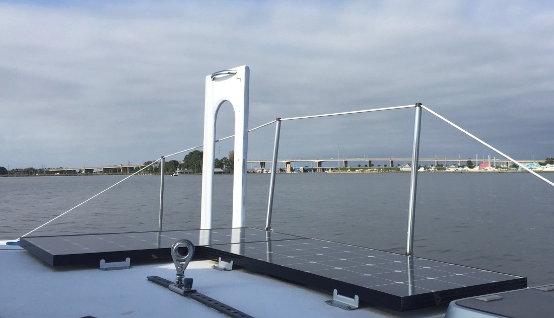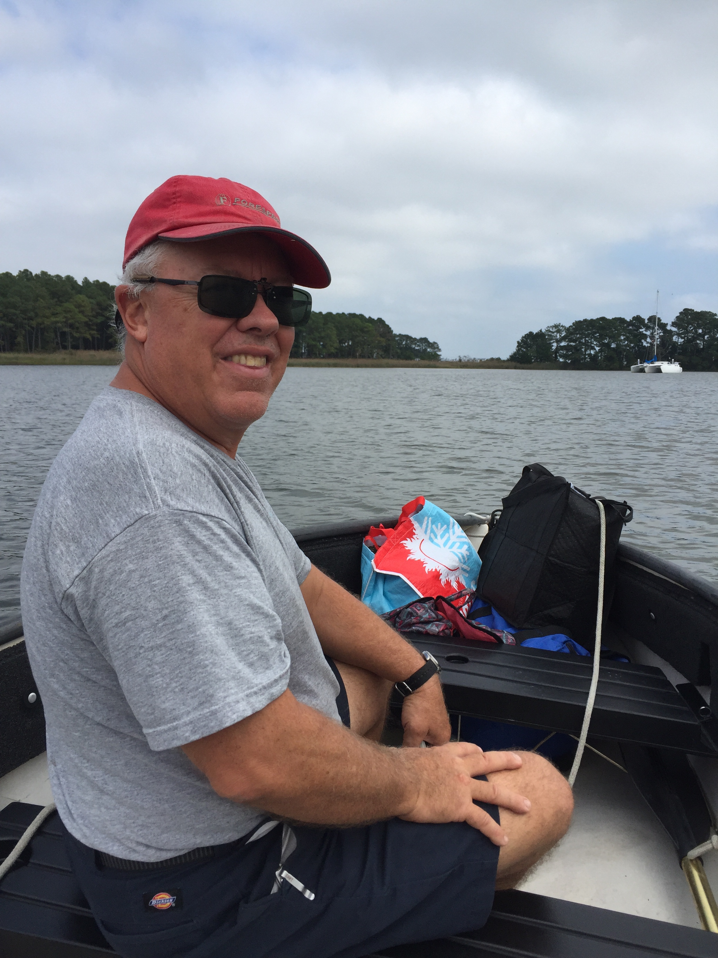 This bulkhead tie-up was our first non-anchoring or sailing night since leaving home. We do not often dock as our vessel is a trimaran and too wide (22′ 6″) for most slips. We vastly prefer the freedom and peace of mind of being at anchor versus tied to a dock. However, the canal was quite still and narrow. There is certainly no room to swing at anchor. Street noise was loud, but not bothersome and subsided before bedtime. Tom made a quick run to a local Food Lion for fresh food as this was a very good supply stop and a short walk away.