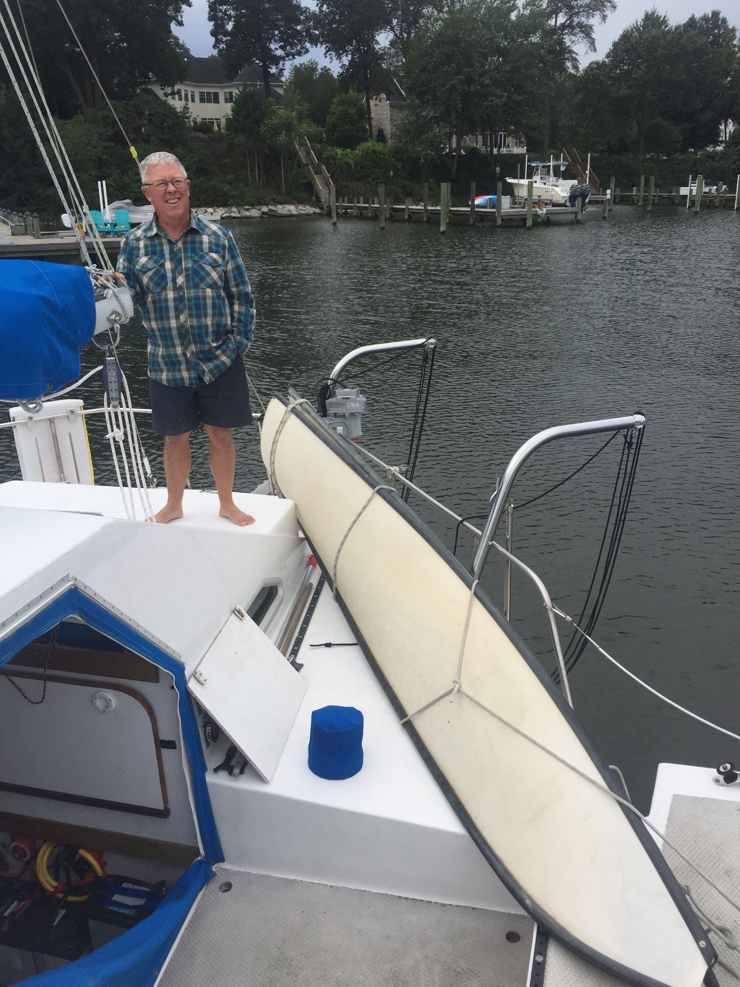 Yes, we are living and working on our boat in exotic harbors! Our sonic wind instrument on top of the mast is no longer discoverable by the network. It is more challenging to sail without this instrument that provides wind direction and speed. However, we will add some ribbons to the shrouds and continue to sail the old fashioned way. Tom climbed the mast stairs and/or was winched up while in the bosuns chair. He was not able to remove the device as he couldn’t get high enough to get a two handed grip on it to unscrew it. We will need a different style of mast climber or a rigger’s help in the near future. Sadly, they no longer make this model. Although the manufacturer may be able to repair it. We’ve ordered the older style with the spinning cups and will wait for that to arrive before continuing with this repair project.