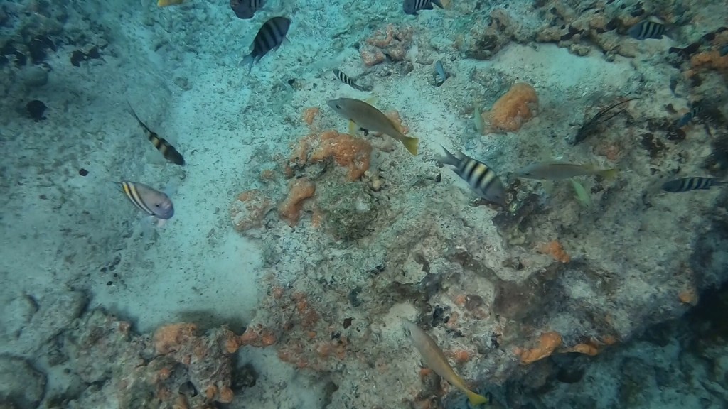 Next day we sailed to the west side of Pipe/Fowl Cay. Two things we want to see here: Rachel’s Bubble Bath at high tide, and some underwater caves at low tide. Mark and Lisa joined us on Lone Star and we motored 1.6 miles up to Compass Cay and immediately went to Rachel’s bath. We were a little past high tide so the bubbles weren’t very frothy, but we saw the leftover froth on the approach. Must be very impressive with an east wind and astronomical high tide. We had lunch together then went snorkeling at the caves.