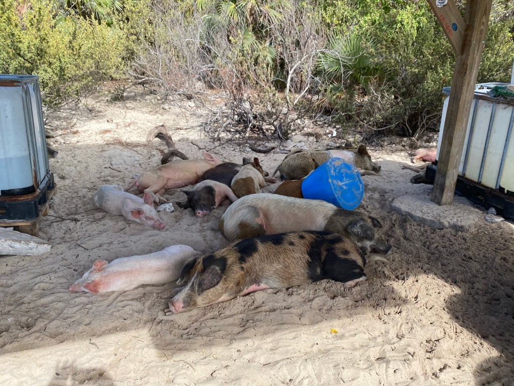 A popular stop for cruisers, tourists and even locals is to visit the once wild pigs at Big Majors. Sailors of old dropped off breading pairs of pigs to fend for themselves on several Bahamian islands. These sailors planned to return for fresh meat as needed. They did the same with goats as we’ve witnessed in the Ragged Islands and perhaps with roosters and chickens as we hear them everywhere!