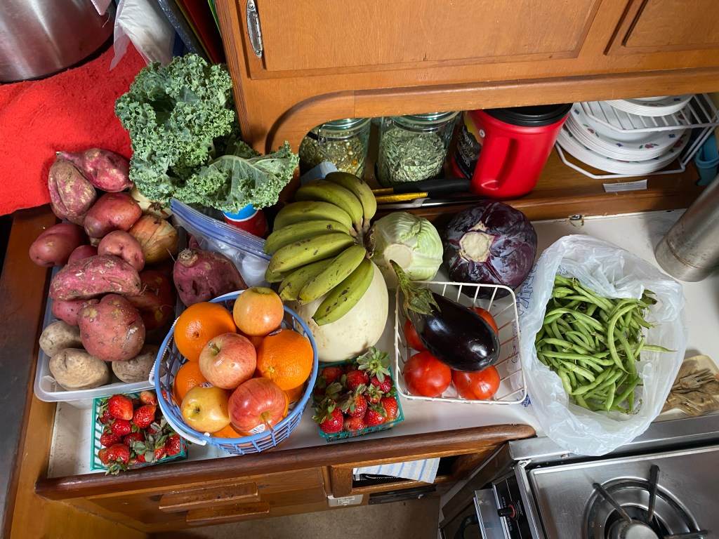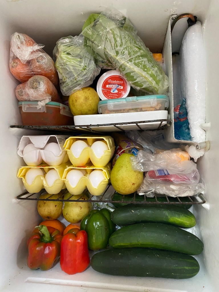 Bananas, melon, cabbages, green beans, tomatoes, eggplant, fresh picked strawberries, apples, oranges, white & sweet potatoes, onions, and kaleCarrots, broccoli, romaine, pears, farm fresh eggs, bell peppers, cucumbers, celery and scallions Yes, the refrigerator needs to be defrosted!!