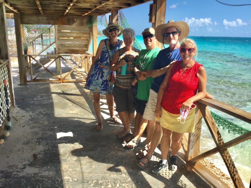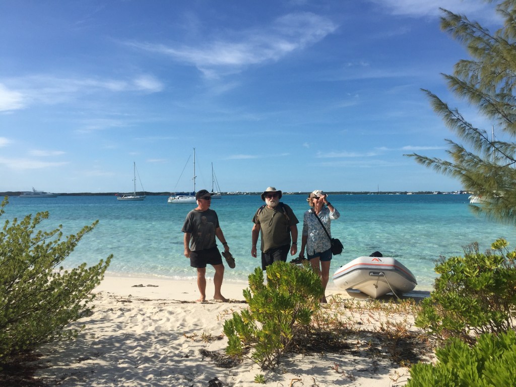 Having too much fun cruising with buddy boats. Spring season in the Bahamas is a lot less crowded than winter season and the cold fronts do not come this far south very often in April. We arrived with our Buddy Boat UJAM’n from Luperon, Dominican Republic. We traveled 370 miles in two and a half days. Well UJAM’n arrived before dark. We anchored just outside Kidds Cove, George Town on April 7 after 9 pm, using radar and chart plotter, to distance ourselves from nearby boats. We promptly went to bed. In the morning, we covered the sails and discovered we were anchored right in front of UJAM’n and Steadfast. Three of the SSCA Caribbean Safety and Security Net Relays anchored in one place! The guys took turns as the relay for the day for the next week. We ended up at Customs and Immigration for check in together as well.