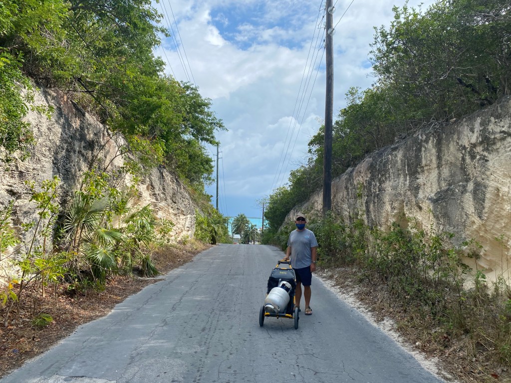 After one rocking night with south winds; we decided to move back to Marsh Harbor for our final stock up before heading to sea, and north toward New England for the summer. There are other cruisers getting ready for their crossings as well. Always fun to compare plans and swap sea stories. On our walk to Maxwells, a large grocery store, we spotted a cruiser on a folding bicycle with a Burley Travoy trailer holding two ten pound propane tanks. Tom stopped him by asking a question so we were able to see what we purchased online last month. He said, it’s the best purchase he ever made! We’re looking forward to getting ours!